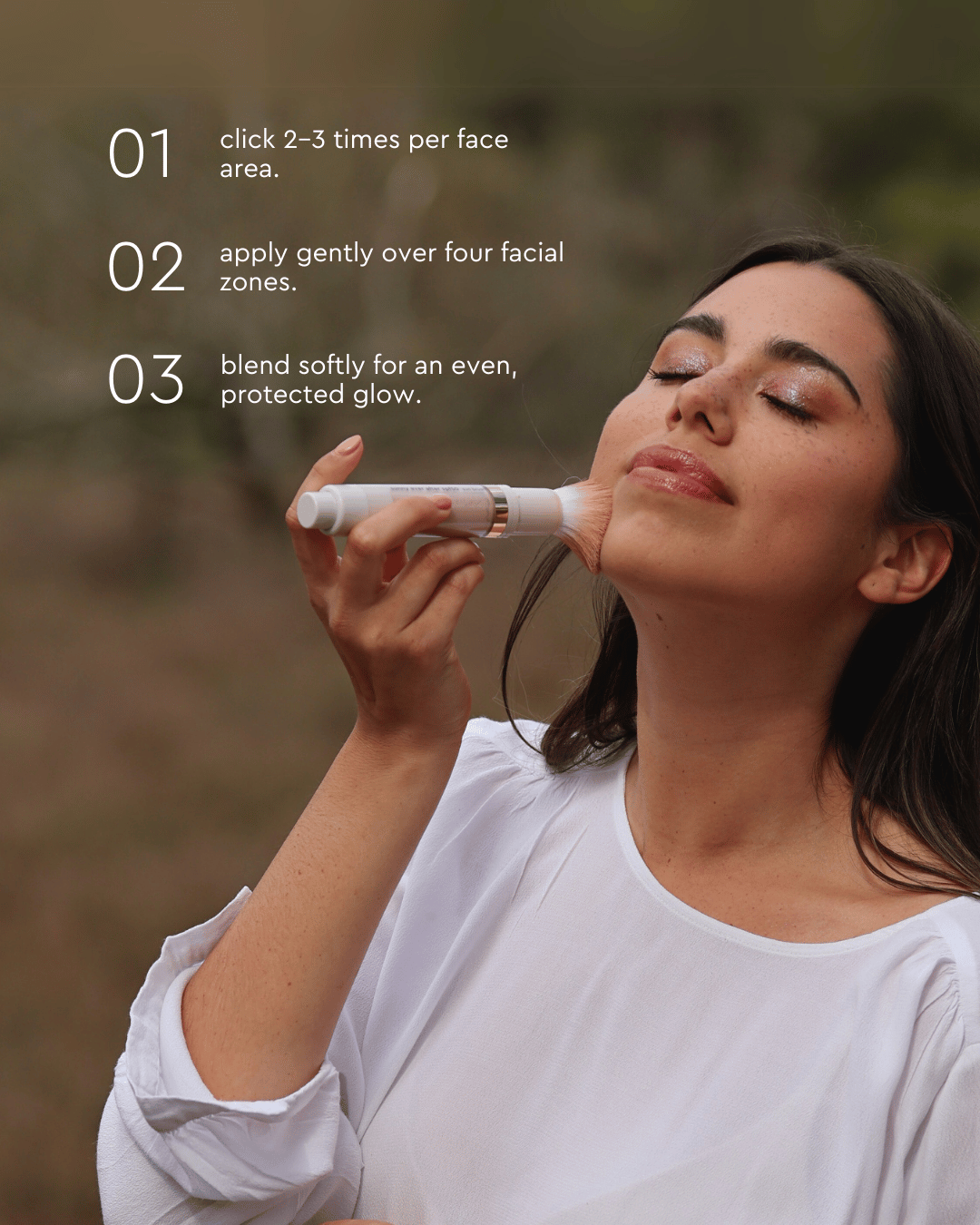 click & protect: click the bottom of the brush to release the powder. the built-in brush makes application simple, whether you wear it over or under your makeup. use as an additional layer of sun protection, never as a replacement for your primary sunscreen. perfect as a finishing touch: a soft matte look with added care. remember to reapply every 2 hours, especially after swimming, sweating or towel-drying, to stay protected all day.