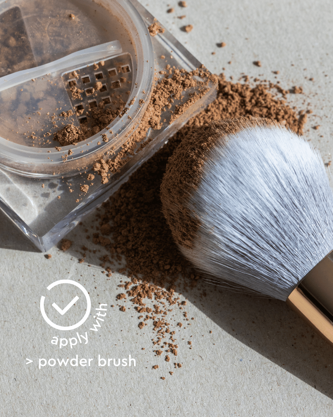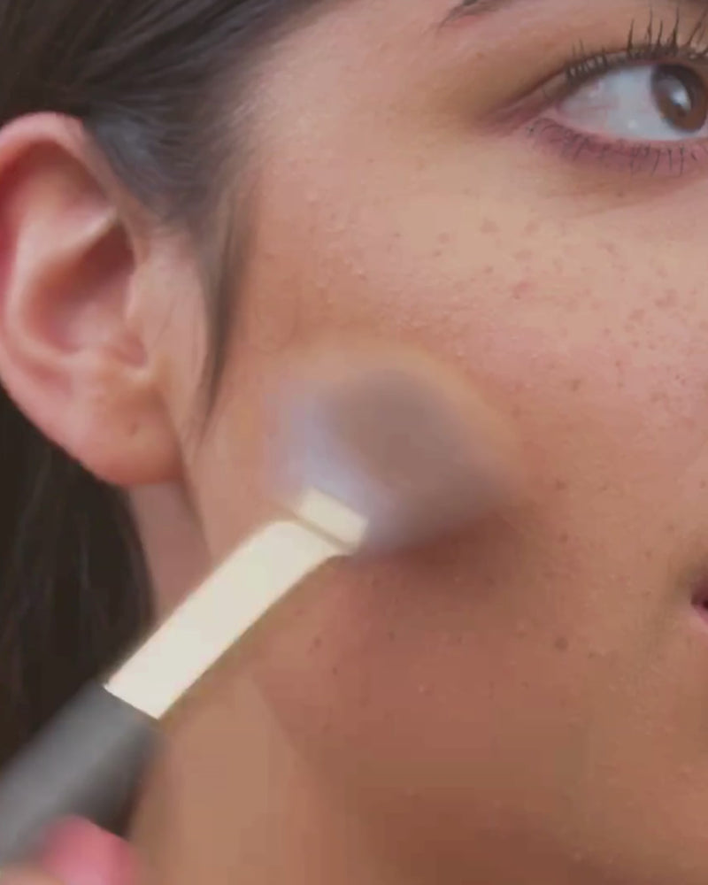 swirl your brush in the lid to pick up the loose mineral bronzer, tap off any excess, and sweep onto the areas where the sun naturally hits your face — cheeks, forehead, nose, and chin. blend well for a warm, sunkissed look. pro tip for an all-over glow, dust lightly over your collarbones and shoulders. mist your brush with fixing spray before picking up the loose mineral bronzer for a more intense effect.